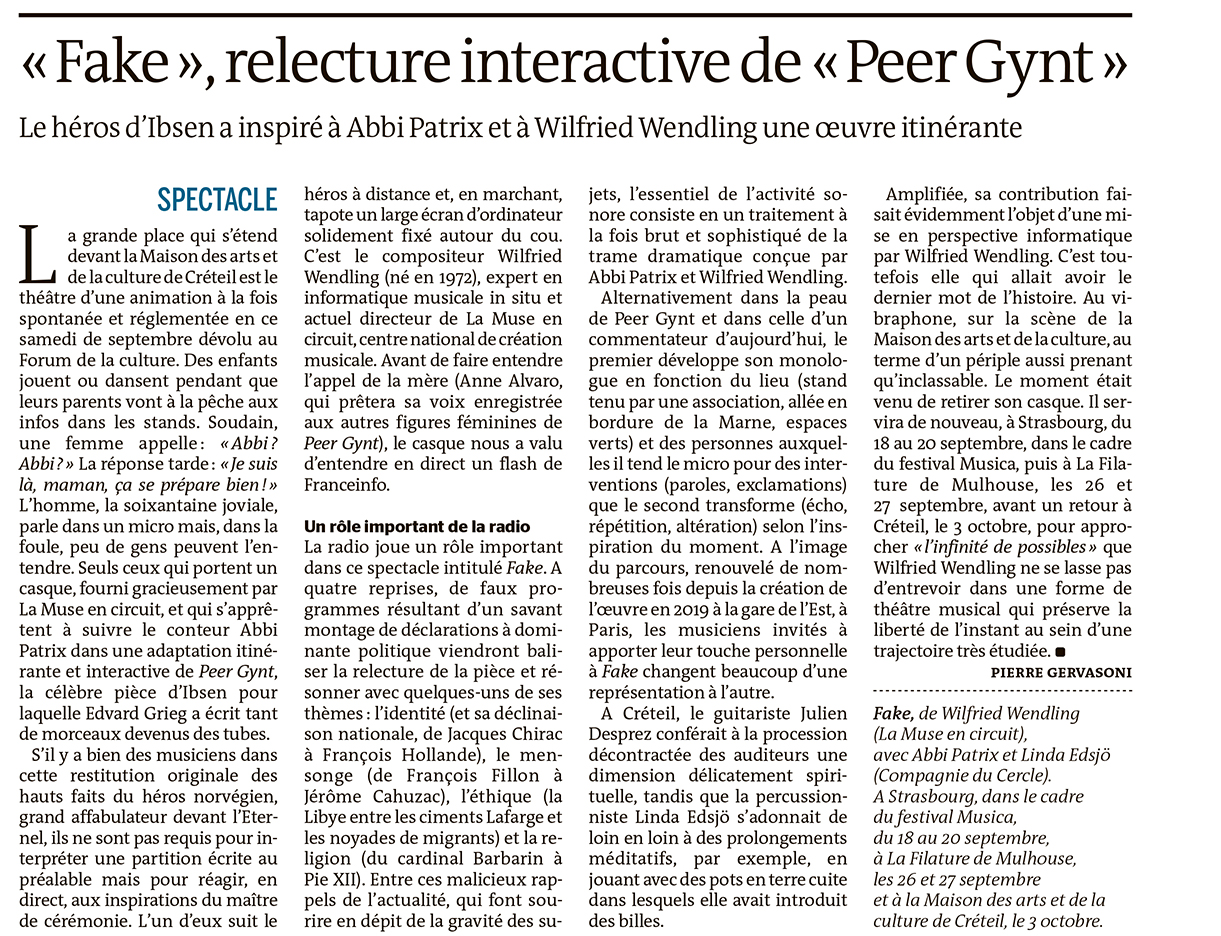 « Il nous avait épatés en 2017 avec un « HAMLET » crépusculaire, mêlant la vidéo et la musique électronique, que portait l’immense Serge Merlin. Le metteur en scène et compositeur Wilfried Wendling s’attaque à un nouveau projet bizarroïde : Peer Gynt d’Ibsen, mais… donné dans un lieu ouvert. On fonce !… » – M. P., Le Canard enchaîné